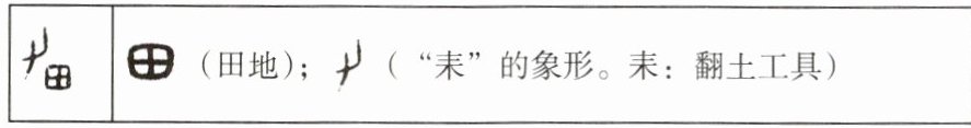 $\boxed{\begin{array}{|c|c|}\hline \oplus & \oplus(田地);\not(“耒”的象形。耒:翻土工具) \\ \hline\end{array}\\ \hline }$