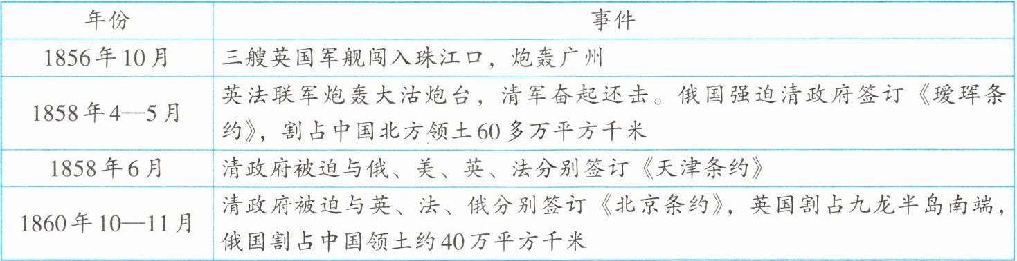 (1)据材料一和所学知识回答,大事年表所述的是哪场战争,并指出该战争期间割占中国领土的两个国家。
