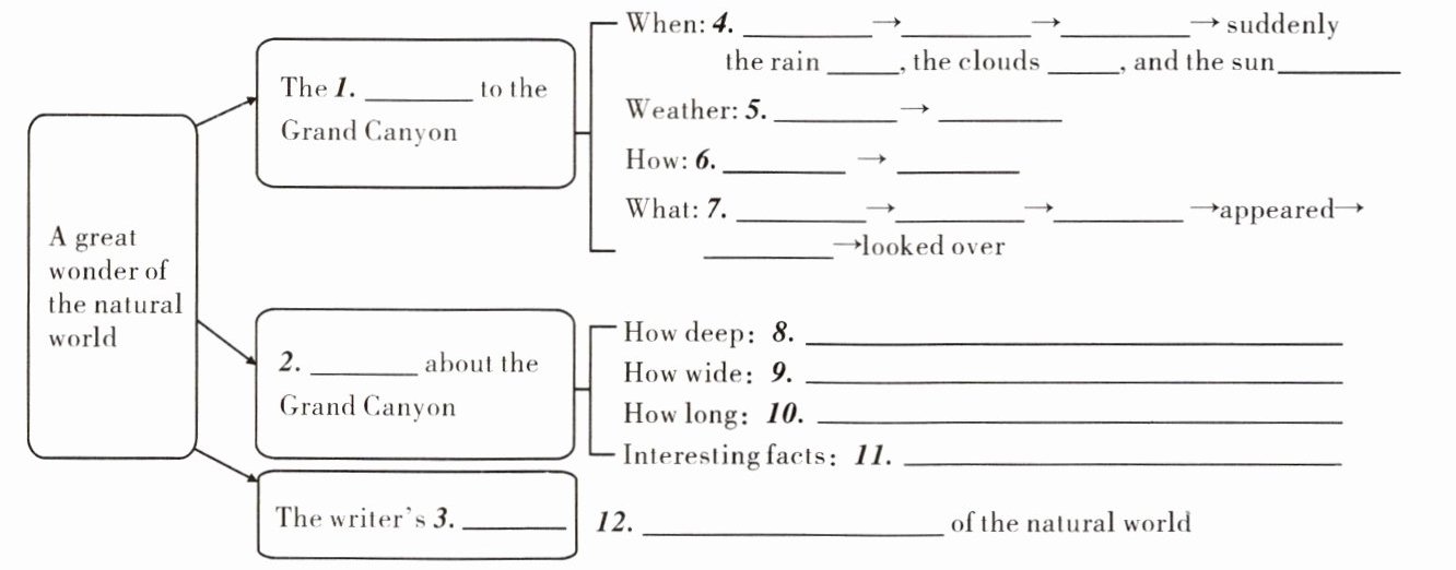 (shine) on the rocks. I looked down to the bottom of the canyon. There was a stream which was nearly one mile below me. Then I looked across to the other side of the canyon. It was about fifteen 7. miles