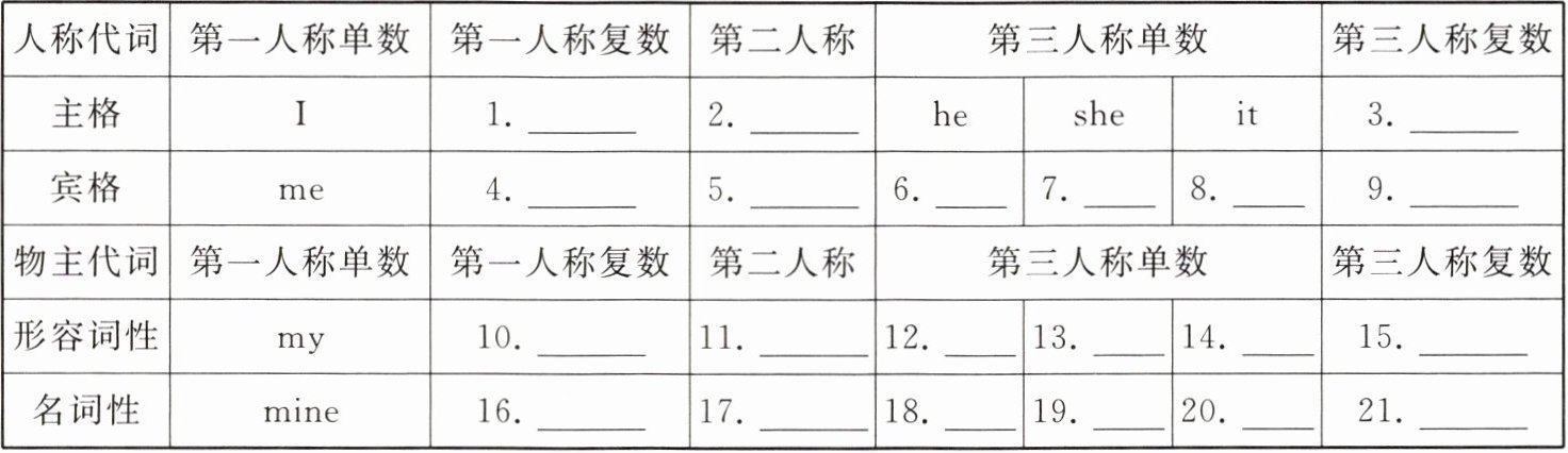 | 主格 | I | 1. ______ | 2. ______ | he | she | it | 3. ______ |