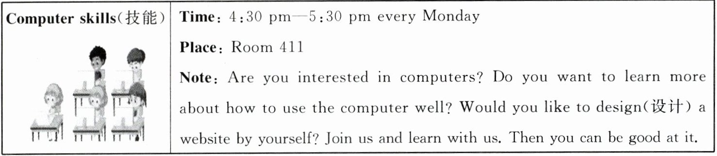 | Computer skills(技能) | Time: 4:30 pm—5:30 pm every MondayPlace: Room 411Note: Are you interested in computers? Do you want to learn more about how to use the computer well? Would you like to design(设计)a website by yourself? Join us and learn with us. Then you can be good at it. |