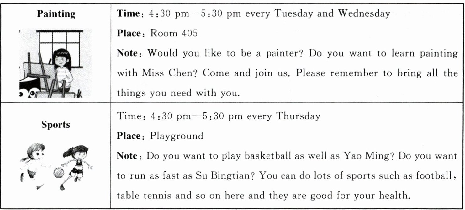 | Sports | Time: 4:30 pm—5:30 pm every ThursdayPlace: PlaygroundNote: Do you want to play basketball as well as Yao Ming? Do you want to run as fast as Su Bingtian? You can do lots of sports such as football, table tennis and so on here and they are good for your health. |
