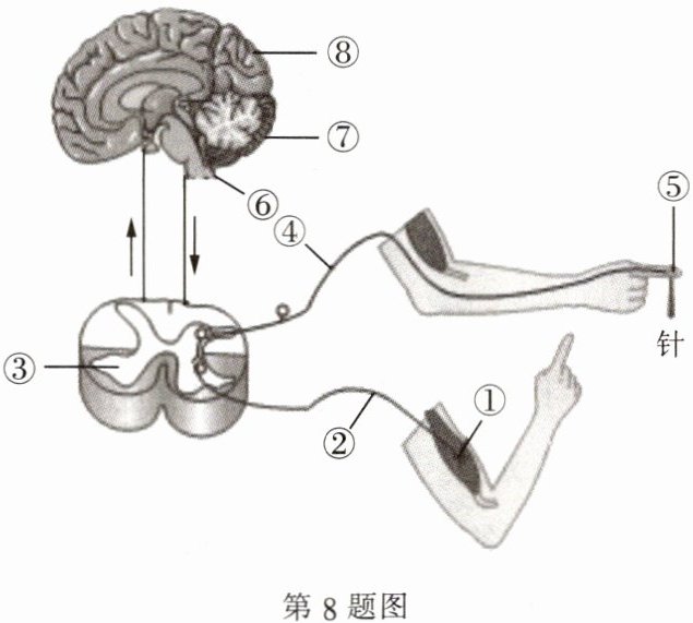 8. 如图是采血检查时,患者的手被针扎后的神经传导过程示意图。下列叙述正确的是(
