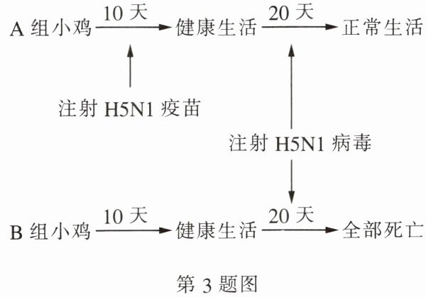 3. 已知某禽流感的病原体是H5N1,科学家已研制出相应的疫苗。疫苗在广泛应用之前必须进行动物实验:将一群未感染过H5N1的健康小鸡分为A、B两组,实验过程和结果如图所示。请分析并回答相关问题。