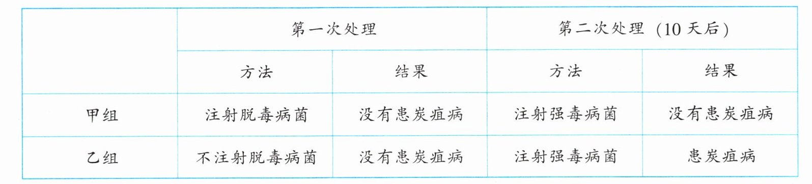 4. 炭疽病是由炭疽杆菌引起的一种人畜共患的体表传染病。巴斯德在研究家畜的炭疽病时,把供实验用的绵羊分为甲、乙两组,进行了一项著名的实验。实验方法与结果如下表所示。
