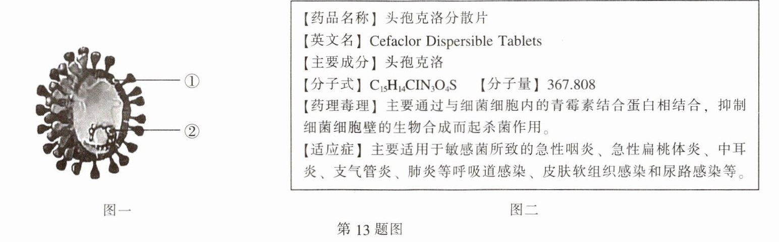 13. (2.5分) 病毒可以引起传染病。图一为某病毒的模式图,图二为某药物说明书的部分内容。结合图示回答下列问题。