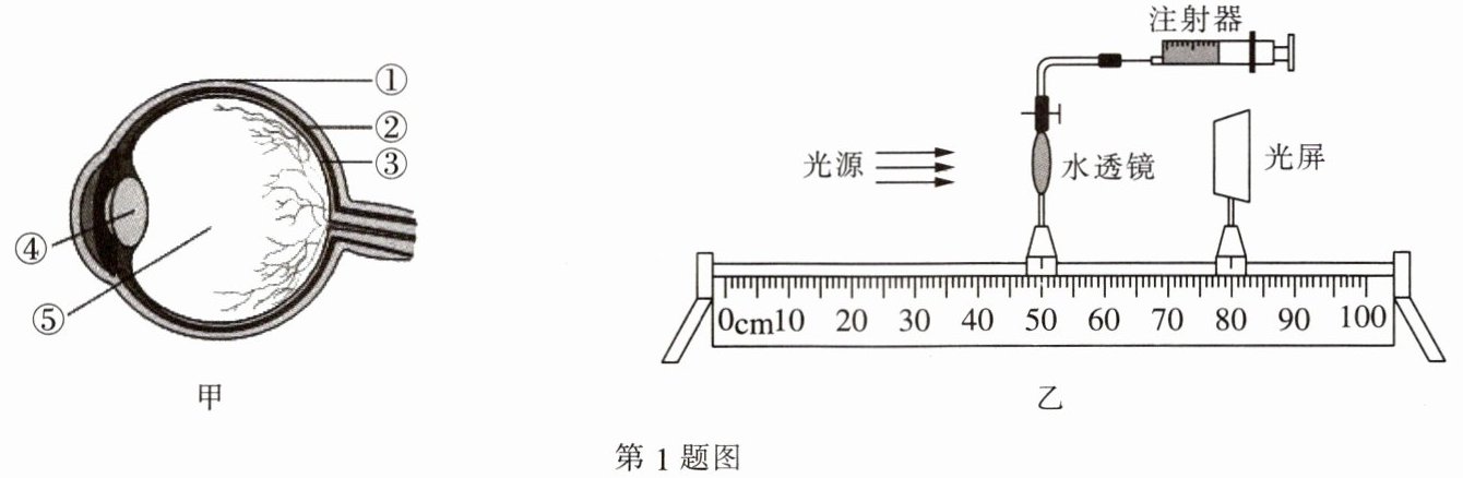 1. 为了探究眼球的结构和成像原理,某小组设计并制作了模型(如图乙),光源位置固定不变,注射器注水或抽水可以使水透镜的曲度改变,光源发出的光线经过水透镜折射,在光屏上形成清晰的物像。下图甲为眼球结构示意图,下列说法正确的是(