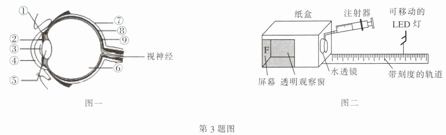 3. 某班的同学利用水透镜和其他材料,制作了人体眼球成像模型(如图二)。请你观察模型,并结合眼球结构示意图(如图一),回答下列问题。(“[ ]”中填图中序号)