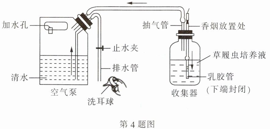 4. 吸烟的危害越来越受到社会公众的关注,某校同学开展了自制实验装置,探究香烟烟雾对草履虫影响的项目式学习活动,通过观察香烟烟雾中的焦油对草履虫纤毛的影响,向公众宣讲吸烟有害健康。实验过程如下: