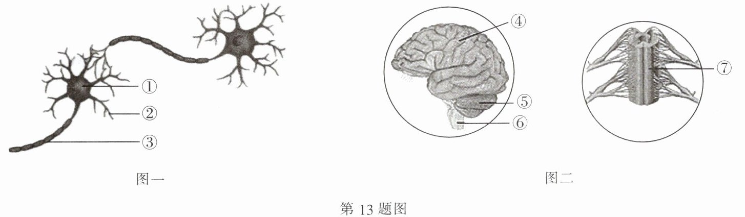 13. (4分) 图一是神经元的结构及神经元之间相互联系的示意图,图二是脑和脊髓的结构示意图。结合图示回答问题。