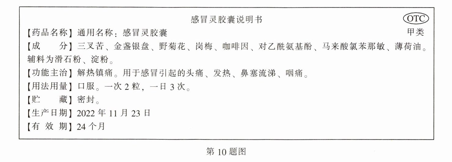 10. 某同学感冒了,在家庭小药箱中找到一盒药。该同学在阅读药物说明书后作出下列判断,其中错误的是(