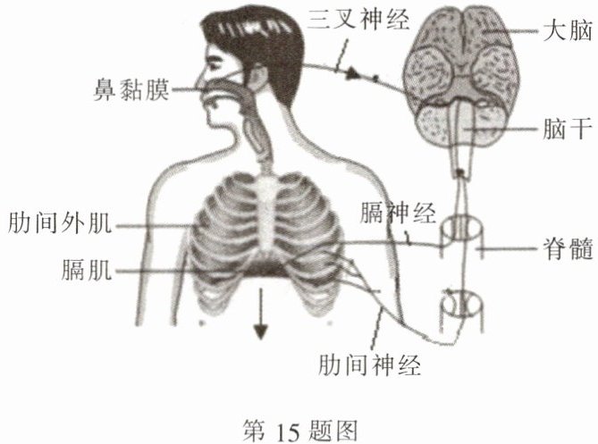 15. (3.5分) 流感病人鼻腔里有大量病毒和细菌,鼻腔黏膜受到它们的刺激,人就会接二连三地打喷嚏。有些对花粉过敏的人,在赏花时也会不断地打喷嚏。请分析回答下列问题。