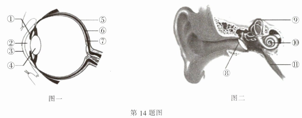14. (3分) 某同学经常躲在被窝里戴着耳机看手机,严重影响了视力和听力,学习成绩也直线下降。图一和图二分别是眼球和耳的基本结构示意图,结合图示回答下列问题。