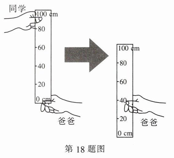 18. (1.5分) 某同学的爸爸认为,他喝酒后会更清醒,反应更敏捷。该同学认为应通过实验来验证爸爸的观点,于是和爸爸一起做了一个“测定反应速度”的实验。实验操作如图所示,实验结果如下表: