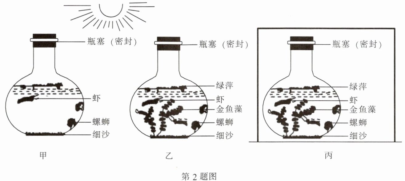 2. 某生物兴趣小组通过制作生态瓶来探究生态系统的组成及其稳定性,实验装置如图所示(甲、乙瓶置于有光的条件下,丙瓶用不透光的盒子罩住)。下列说法正确的是(