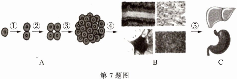 7. 我们体内的器官是由一个细胞经过一系列复杂的过程发育而来的,如下图所示,请据图回答问题: