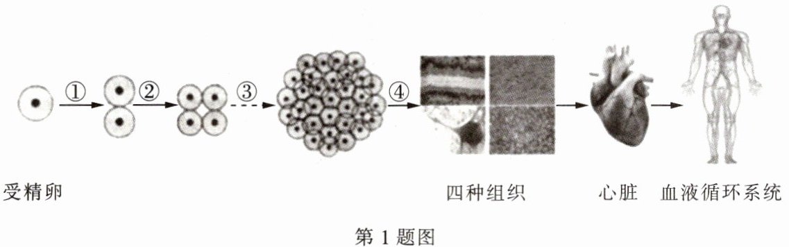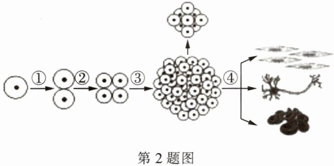 2. (2024·东营)科研人员利用从妊娠末期胎盘中分离出的胚胎干细胞,经过体外细胞培养成功培育出了心肌细胞。依据的原理是图中的过程(