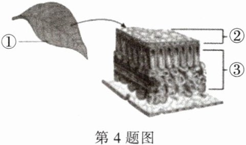4. (2024·成都)某绿色开花植物的叶及其部分结构如图所示。下列对图中①②③所属结构层次的判断,正确的是(