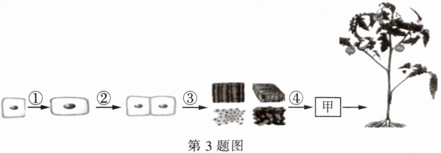 3. (2024·临沂)如图是“细胞怎样构成植物体”的过程示意图,其中“③”和“甲”分别代表(