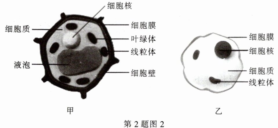 2.(1)E→C→B→D→A (2)生理盐水 碘液 (3)乙 液泡、叶绿体、细胞壁 (4)洋葱鳞片叶内表皮 细胞没有叶绿体,模型中多余叶绿体 (5)细纱布可以更 好地体现细胞膜控制物质进出的功能