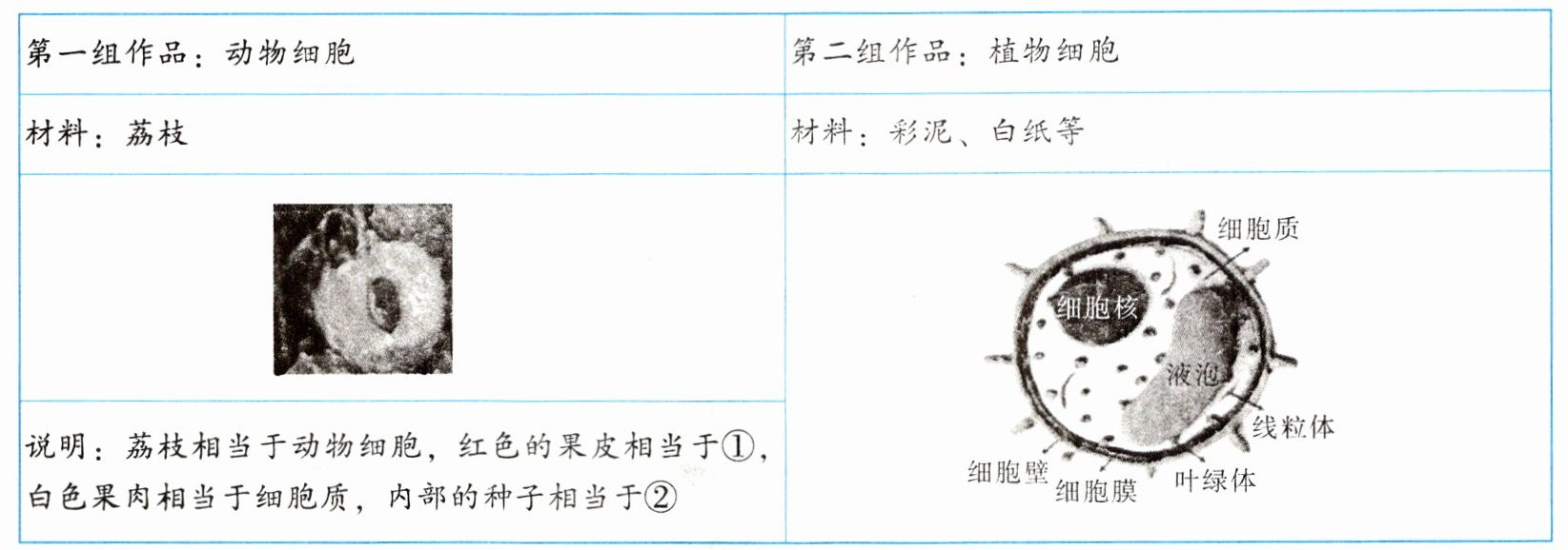 1. 在学习了动、植物细胞的结构后,七年级某班开展了细胞模型制作活动。以下是两个小组的作品。请根据两组作品回答下列问题: