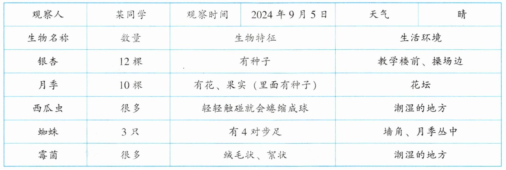 13.(3分)观察是学习生物学的基本方法。下表是某同学书写的生物观察记录表。请分析回答问题: