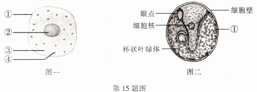 15.(3分)单细胞生物种类繁多,结构和生活方式差异很大。科学家发现多种小球藻具有制备生物柴油的潜能。图一是动物细胞结构示意图,图二是一种小球藻的结构示意图。根据图示分析回答问题: