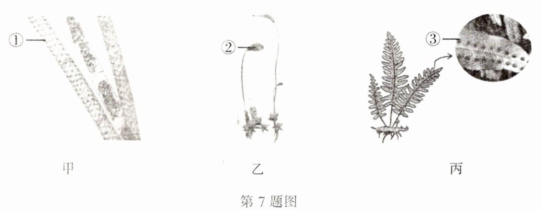 7. 某校生物兴趣小组在调查校园周边生物时,采集到了几种生物,图甲是水绵的结构示意图,图乙为葫芦藓示意图,图丙为肾蕨示意图。请结合图示回答下列问题: