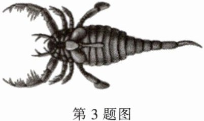 3. 如图,科研人员在华南地区发现了一种新化石,命名为秀山恐鲎(hòu),经复原后发现秀山恐鲎体型庞大,身体和附肢都分节,应属于(