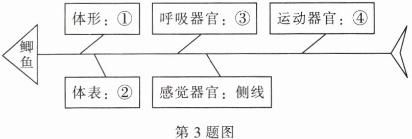 3. (2024·淮安)某同学在观察鲫鱼后,梳理了鲫鱼的部分特征(如图),其中错误的是(
