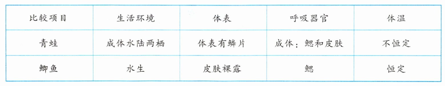 )①皮肤裸露、湿润 ②皮肤能分泌黏液 ③皮肤密布毛细血管 ④皮肤表面覆盖鳞片
