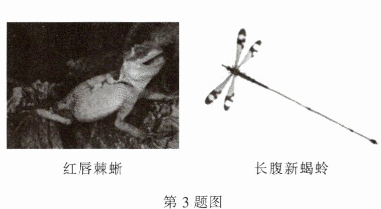 3. (2023·张家界)我国动物家庭又添新成员,如图是近年在云南发现的爬行类新物种红唇棘蜥和长翅目昆虫长腹新蝎蛉。下列有关这两个新物种的分析正确的是(