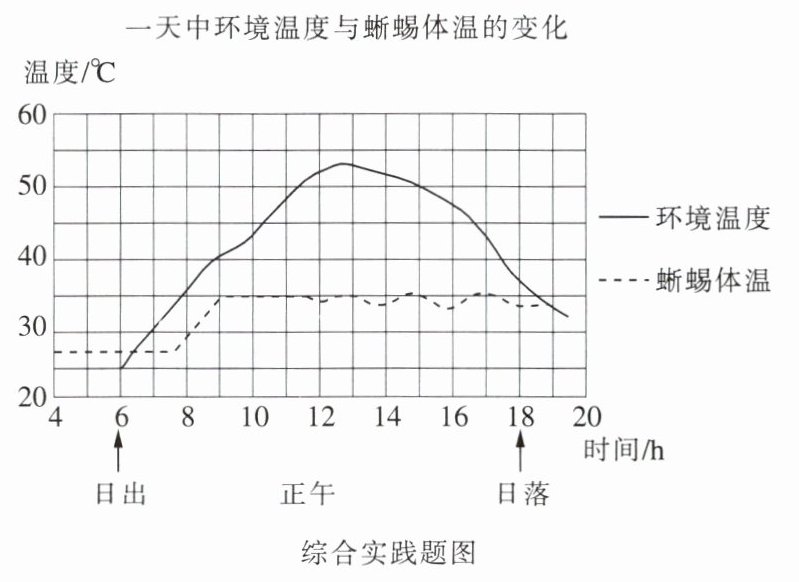 为研究沙漠穴居蜥蜴体温与环境温度的关系,生物学家测试了连续16小时内蜥蜴体温与环境温度,根据数据绘成下图。下列分析错误的是(
