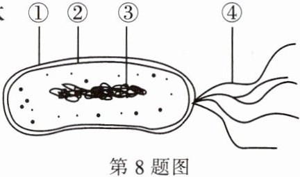8. 幽门螺杆菌(简称“Hp”)感染是导致慢性胃炎的重要病因,是增加患胃癌风险的因素之一。医学上常采用阿莫西林等多种抗生素类药物进行联合治疗。如图是 Hp 的结构示意图,请据图回答下列问题: