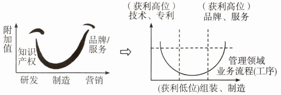 8. 经济学上有一个著名的“微笑曲线”理论:附加值的高点位于产业链的两端(如图)。这一理论给企业的启示是( )