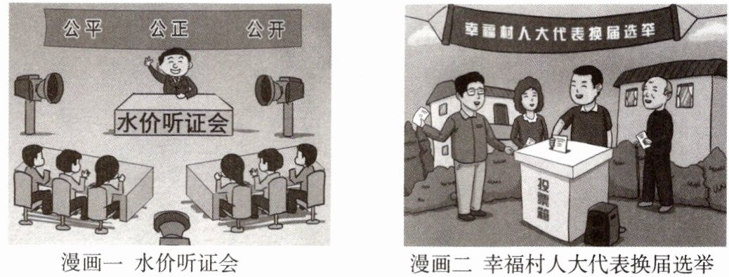 (1)漫画一体现了民主决策;漫画二体现了民主选举。(2)我国社会主义民主是一种新型的民主。全过程人民民主是社会主义民主政治的本质属性,人民当家作主是社会主义民主政治的本质特征;全过程人民民主是最广泛、最真实、最管用的民主;有事好商量,众人的事由众人商量,是人民民主的真谛;我国实行人民民主,既发展选举民主,又发展协商民主;我国坚持走中国特色社会主义政治发展道路,全面发展全过程人民民主,人民当家作主更为扎实,基层民主活力增强,人民享有广泛的民主权利,人民的利益得到越来越切实的保障。