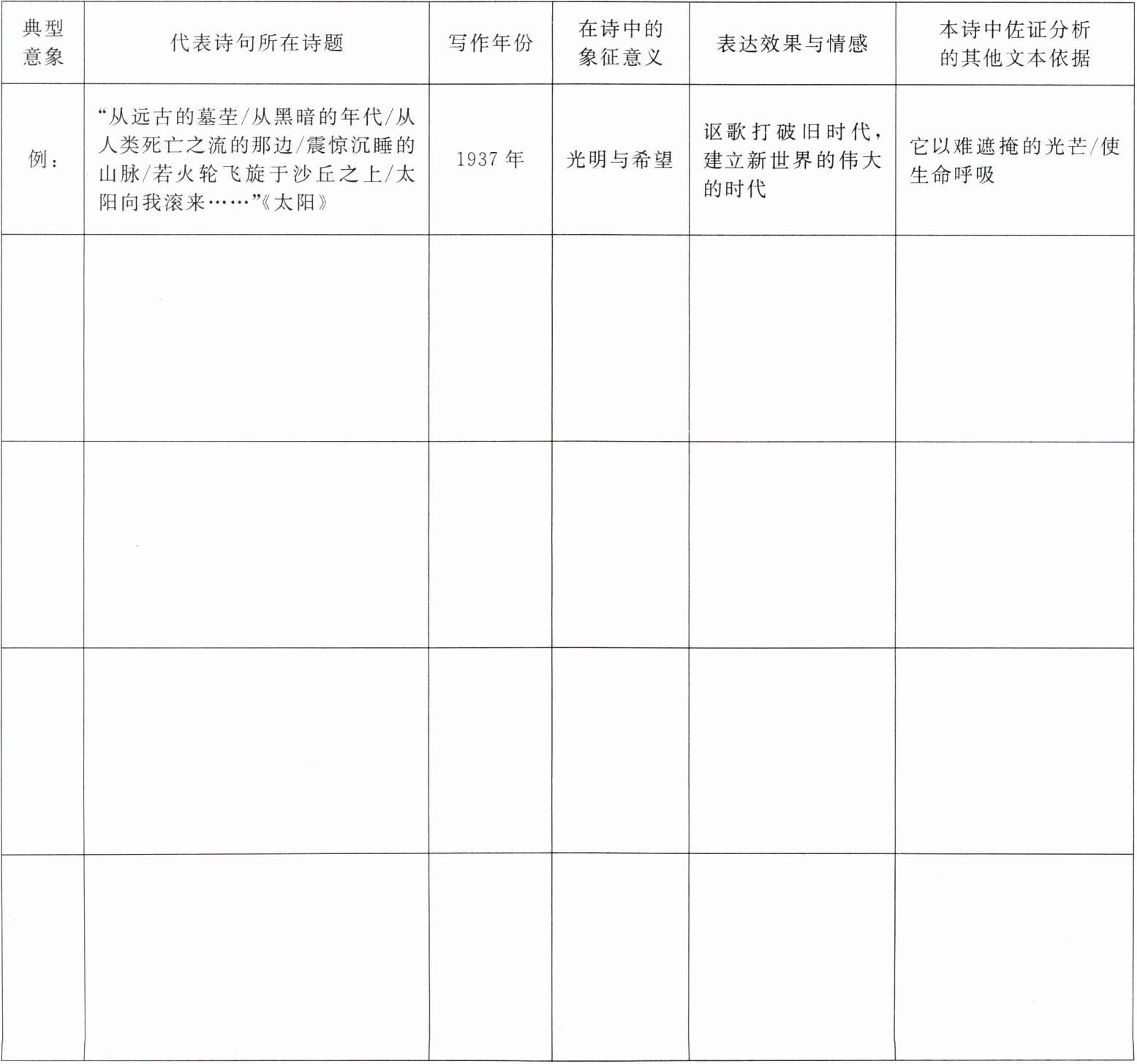 2. 分析艾青诗歌中的主要意象,完成表格,在此基础上将意象进行归类,并说出这样归类的理由。(可以自行补充表格)