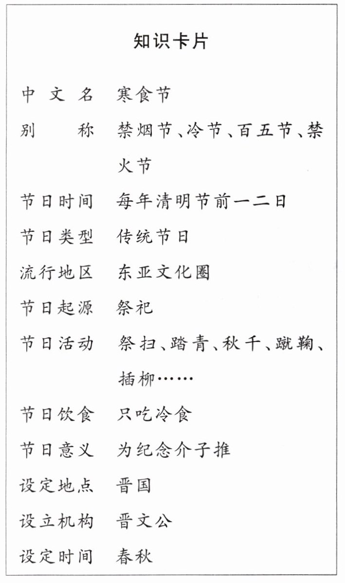 某校开展“知传统节日,承中华文化”综合实践活动,同学们搜集了关于“寒食节”的资料,请阅读下面四则材料,完成下列任务。