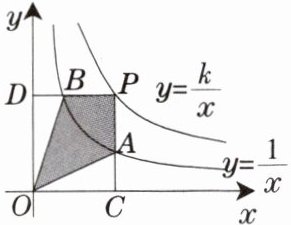 5. 两个反比例函数 $ y = \frac{k}{x} $ 和 $ y = \frac{1}{x} $ 在第一象限内的图象如图所示,点 $ P $ 在 $ y = \frac{k}{x} $ 的图象上,$ PC \perp x $ 轴于点 $ C $,交 $ y = \frac{1}{x} $ 的图象于点 $ A $,$ PD \perp y $ 轴于点 $ D $,交 $ y = \frac{1}{x} $ 的图象于点 $ B $,当点 $ P $ 在 $ y = \frac{k}{x} $ 的图象上运动时,以下结论:① $ \triangle ODB $ 与 $ \triangle OCA $ 的面积相等;②四边形 $ PAOB $ 的面积不会发生变化;③ $ PA $ 与 $ PB $ 始终相等;④当点 $ A $ 是 $ PC $ 的中点时,点 $ B $ 一定是 $ PD $ 的中点。其中一定正确的是