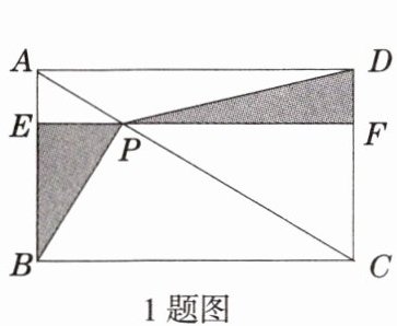 1. 如图,点 $P$ 是矩形 $ABCD$ 的对角线 $AC$ 上一点,过点 $P$ 作 $EF// BC$,分别交 $AB$,$CD$ 于点 $E$,$F$,连接 $PB$,$PD$,若 $AE = 2$,$PF = 9$,则图中阴影面积为