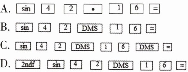 D.$\boxed{2ndf}\ \boxed{\sin}\ \boxed{4}\ \boxed{2}\ \boxed{DMS}\ \boxed{1}\ \boxed{6}\ \boxed{=}$