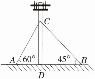 7. 在电线杆上离地面高度 $ 5 $ 米的 $ C $ 点处引两根拉线固定电线杆,一根拉线 $ AC $ 和地面成 $ 60° $ 角,另一根拉线 $ BC $ 和地面成 $ 45° $ 角。求两根拉线的总长度。(结果用带根号的数的形式表示)