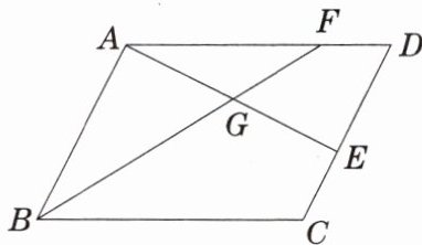 2. 如图,平行四边形 $ABCD$ 中,$AE\perp CD$ 于 $E$,$BF$ 平分 $\angle ABC$ 与 $AD$ 交于点 $F$,$AE$ 与 $BF$ 交于点 $G$。