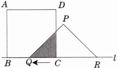 有一边长为 $ 5 \, cm $ 的正方形 $ ABCD $ 和等腰 $ \triangle PQR $,$ PQ = PR = 5 \, cm $,$ QR = 8 \, cm $,点 $ B $,$ C $,$ Q $,$ R $ 在同一条直线 $ l $ 上,当 $ C $,$ Q $ 两点重合时,等腰 $ \triangle PQR $ 以 $ 1 \, cm/秒 $ 的速度沿直线 $ l $ 按箭头所示方向开始匀速运动,$ t $ 秒后正方形 $ ABCD $ 与等腰 $ \triangle PQR $ 重合部分的面积为 $ S \, cm^2 $.