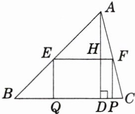 解:在矩形$EFPQ$中,$EF// PQ$,$\therefore \angle AEF=\angle B$,$\angle AFE=\angle C$,$\therefore \triangle AEF\backsim\triangle ABC$.$\because AD\perp BC$,$EF// PQ$,$\therefore AH\perp EF$,$\therefore \frac{AH}{AD}=\frac{EF}{BC}$.设矩形$EFPQ$的面积为$y$.$\because \frac{AH}{AD}=\frac{EF}{BC}$,$\therefore \frac{AH}{4}=\frac{x}{5}$,$\therefore AH=\frac{4}{5}x$,$\therefore DH=4-\frac{4}{5}x$,$\therefore y=-\frac{4}{5}x^2+4x=-\frac{4}{5}(x-\frac{5}{2})^2+5(0<x<5)$.又$\because a=-\frac{4}{5}<0$,$\therefore$ 当$x=\frac{5}{2}$时,$y$有最大值$5$.即当$x=\frac{5}{2}$时,矩形$EFPQ$的面积最大,最大面积为$5$.