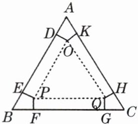 10.解:如图,$\because\triangle ABC$为等边三角形,$\therefore\angle A = \angle B = \angle C = 60^{\circ}$,$AB = BC = AC$.$\because$筝形$ADOK\cong$筝形$BEPF\cong$筝形$CGQH$,$\therefore AD = BE = BF = CG = CH = AK$.$\because$折叠后是一个三棱柱,$\therefore DO = PE = PF = QG = QH = OK$,四边形$ODEP$、四边形$PFGQ$、四边形$QHKO$都为矩形.$\therefore\angle ADO = \angle AKO = 90^{\circ}$.连接$AO$,在$Rt\triangle AOD$和$Rt\triangle AOK$中,$\begin{cases}AO = AO\\OD = OK\end{cases}$$\therefore Rt\triangle AOD\cong Rt\triangle AOK(HL)$.$\therefore\angle OAD = \angle OAK = 30^{\circ}$.设$OD = x$,则$AO = 2x$,由勾股定理就可以求出$AD = \sqrt{3}x$,$\therefore DE = 6 - 2\sqrt{3}x$,$\therefore$纸盒侧面积$=3×(6 - 2\sqrt{3}x)= -6\sqrt{3}x^{2}+18x = -6\sqrt{3}(x - \frac{\sqrt{3}}{2})^{2}+\frac{9\sqrt{3}}{2}$,$\therefore$当$x = \frac{\sqrt{3}}{2}$时,纸盒侧面积最大为$\frac{9\sqrt{3}}{2}$.