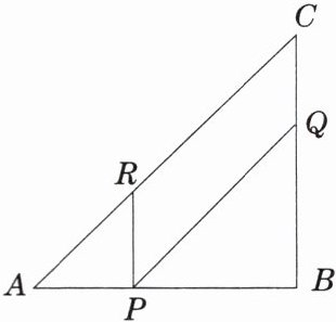 2. 在等腰直角三角形 $ABC$ 中,$AB = BC = 8cm$,动点 $P$ 从 $A$ 出发,沿 $AB$ 向 $B$ 移动,通过点 $P$ 作 $PR// BC$,$PQ// AC$,交 $AC$,$BC$ 于 $R$,$Q$。问: