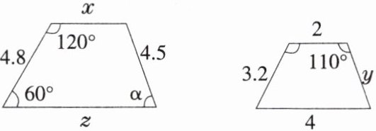 6. 已知如图所示的两个四边形相似,求出未知的$x$,$y$,$z的长和∠α$的度数。
