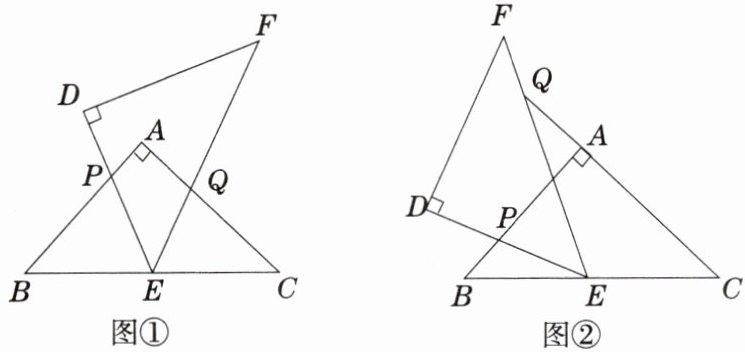 (1)如图①,当点 $Q$ 在线段 $AC$ 上,且 $AP = AQ$ 时,求证:$\triangle BPE\cong\triangle CQE$;