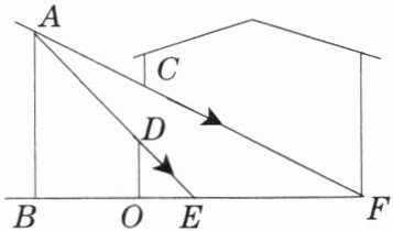 6. 如图,小明家窗外有一堵围墙 $AB$,由于围墙的遮挡,清晨太阳光恰好从窗户的最高点 $C$ 射进房间的地板 $F$ 处,中午太阳光恰好能从窗户的最低点 $D$ 射进房间的地板 $E$ 处,小明测得窗户距地面的高度 $OD = 1$ m,窗高 $CD = 1.5$ m,并测得 $OE = 1$ m,$OF = 5$ m,求围墙 $AB$ 的高度。